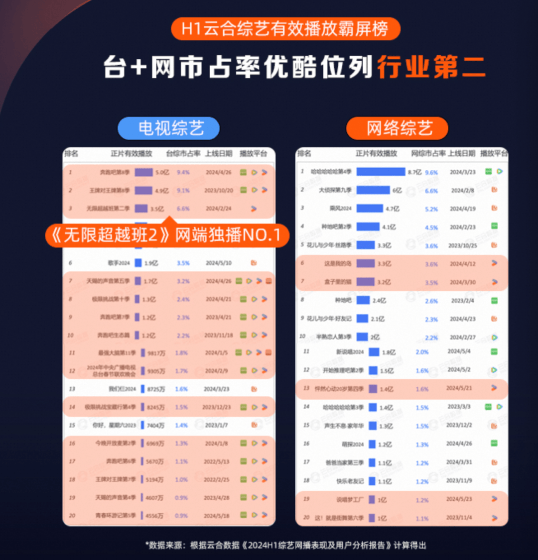 根据云合数据,今年H1全网正片累计有效播放同比增长5%,在更季播正片有效播放同比下降2%;而优酷实现正片累计有效播放同比增长103%,在更季播正片有效播放同比增长77%,数据远超行业均值。