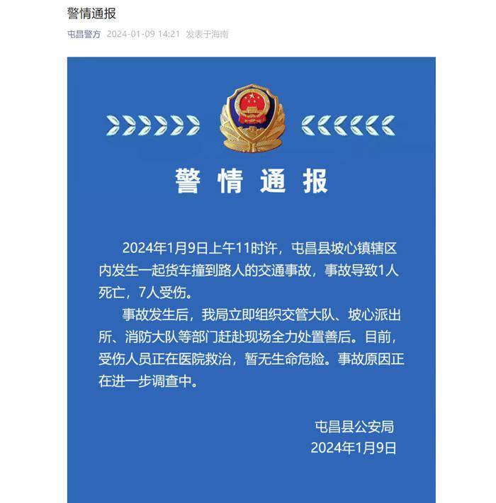 9日下午,屯昌县公安局发布警情通报称:2024年1月9日上午11时许,屯昌县坡心镇辖区内发生一起货车撞到路人的交通事故,事故导致1人死亡,7人受伤。