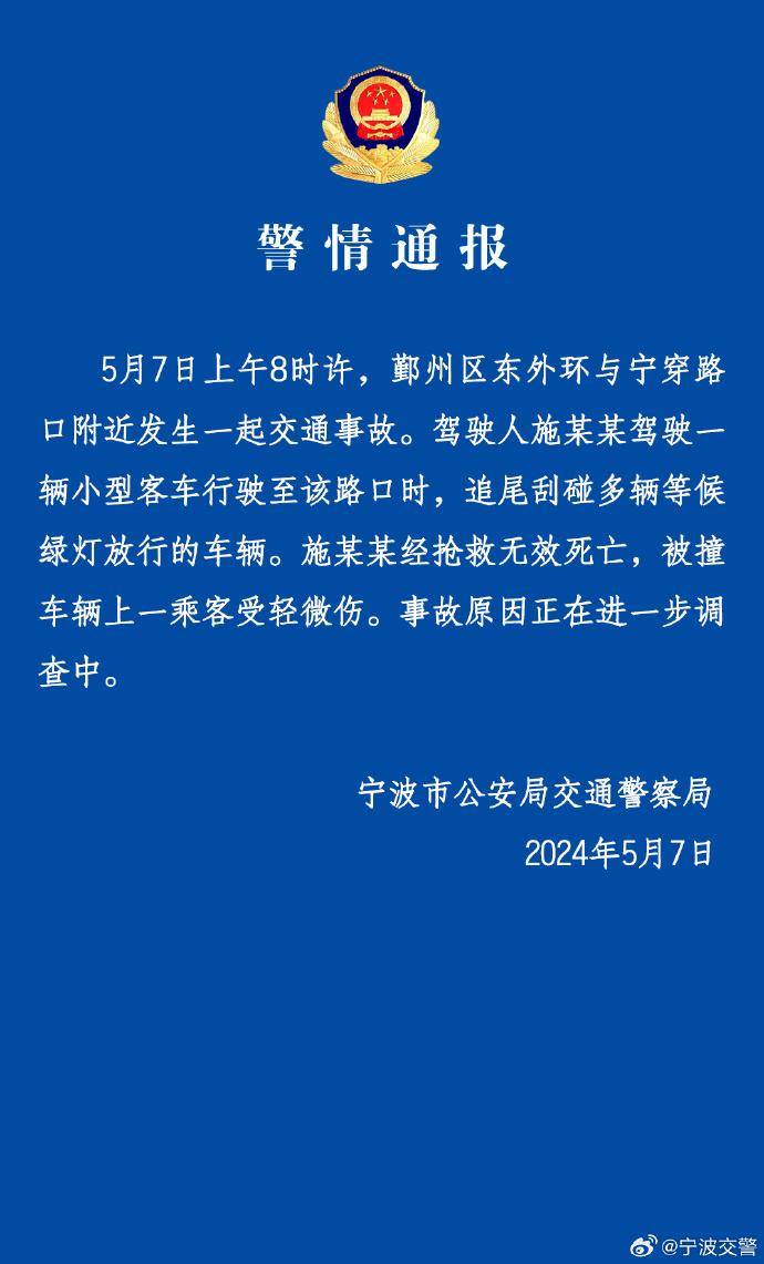5月7日上午8时许,勤州区东外环与宁穿路口附近发生一起交通事故。驾驶人施某某驾驶一辆小型客车行驶至该路口时,追尾刮碰多辆等候绿灯放行的车辆。施某某经抢救无效死亡,被撞车辆上一乘客受轻微伤。事故原因正在进一步调查中。