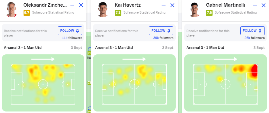 哈弗茨对角色的不适应还影响了同侧队友的发挥。左后卫津琴科,原本在本方持球时要内收到后腰位置协助组织。但由于哈弗茨的“隐身”,津琴科本场比赛更多地包办了左路的串联。而左边锋马丁内利,由于缺少队友的策应,被迫陷入了更多一对一甚至一对二的处境中。本场比赛,马丁内利有多达13次地面对抗,位列队内第一。22次丢失球权,同样位列队内第一。这两项数据,均与哈弗茨的“隐身”息息相关。