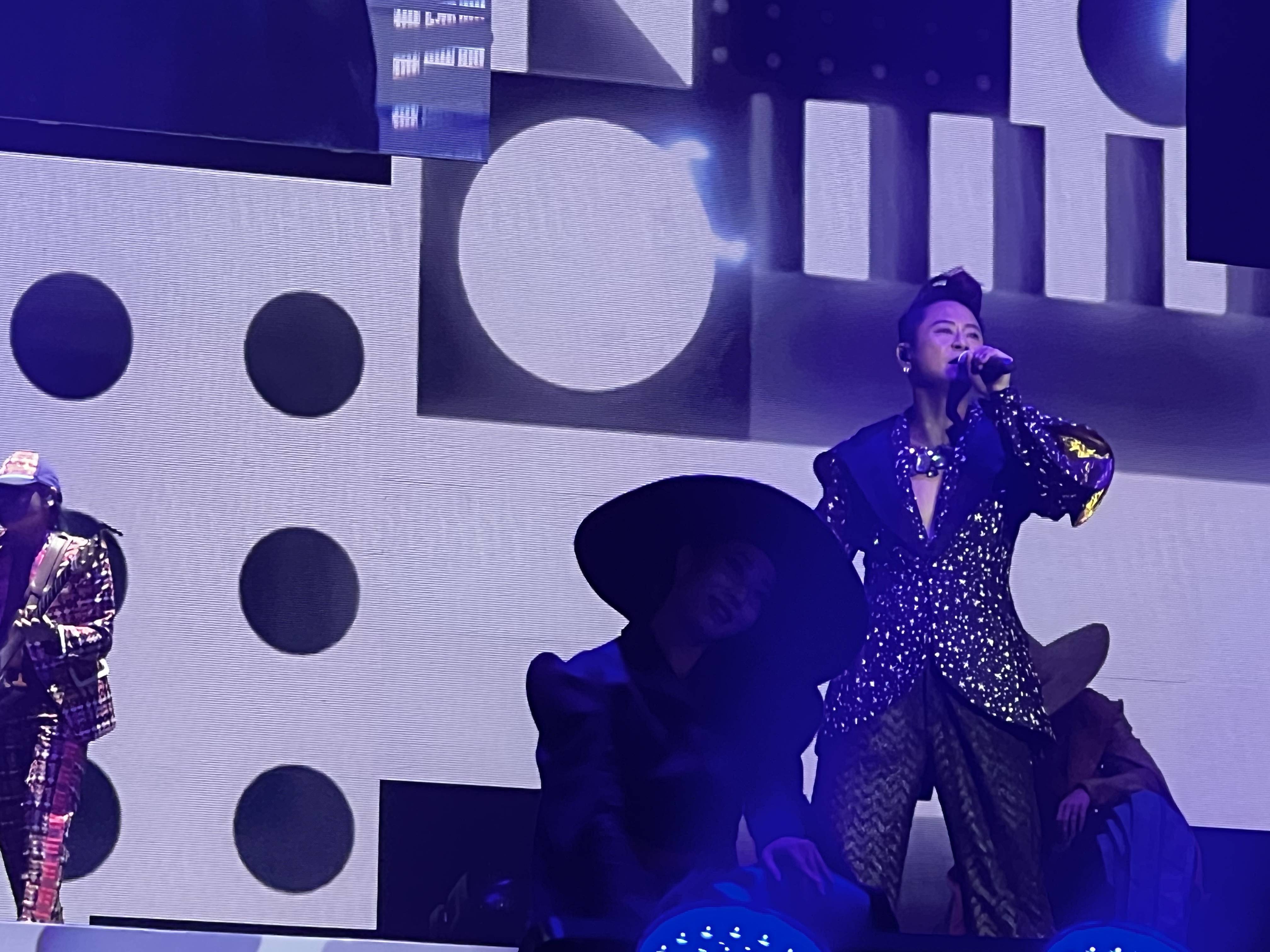草蜢在舞台、灯光、音响、服饰、歌曲及舞蹈编排上都花尽心思,为演唱会注入新元素的同时,也保留一贯的强劲节拍、热烈舞蹈。多媒体视频制作,并没有采用当下流行的“科技感”“未来感”元素,反而用平静的画面语言,生活化的场景片段,让观众在欣赏歌曲的时候有了更多的代入感。和当下顶流艺人的制作相比,草蜢的GRASSHOPPER CONCERT没有超高的舞台背景,没有更多的翻转装置,没有流行的裸眼3D视效……但是,草蜢三子的舞台魅力让观众欣赏到了一场“纯正”的唱跳盛宴,这就是草蜢演唱会最大的魅力所在。当晚,三子状态大勇,特别是蔡一杰。这位组合C位小生,不仅是演值担当,更是唱功实力担当。他在台上表演后空翻,获全场掌声,但直到演唱会接近尾声,杰仔在台上才道出他前一晚彩排时,不小心拗伤左脚,要用绷带固定脚踭位置,才能负伤演出。作为组合中人气最高的成员,蔡一杰的个人SOLO表演也得到了大家的认可,单飞作品《独行派对》赢得观众掌声一片。