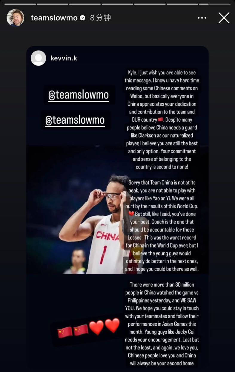 在中国男篮最后一战赛后,李凯尔明确表示自己要返回美国备战NBA新赛季,无法代表中国男篮出战9月份的杭州亚运会。但李凯尔也表示:“今后如果还有机会代表中国男篮出战的话,我当然会打。我时刻准备为国家队的队友提供帮助,让他们知道有个在NBA打球的队友,他们有问题可以随时找我。我会与他们保持联系,与他们一起训练,我不会离开的。”