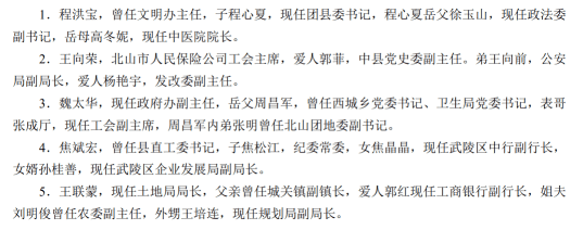 冯军旗博士在论文中也总结出了部分县城关系网。他们通过各种关系运作方式, 形成大大小小的“政治家族”,在后辈就业时,也就能提供一定的帮助。