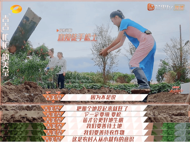 吉美莹在比赛里用手去掰碎土块,因为只有土够细才能利于植物生根。当地村民喊她不要用手去掰土,她却说,农民爱惜田地、爱惜农作物是与生俱来的本能。