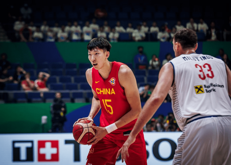 中国男篮首发:15-周琦、8-赵睿、10-周鹏、77-张镇麟、1-李凯尔
