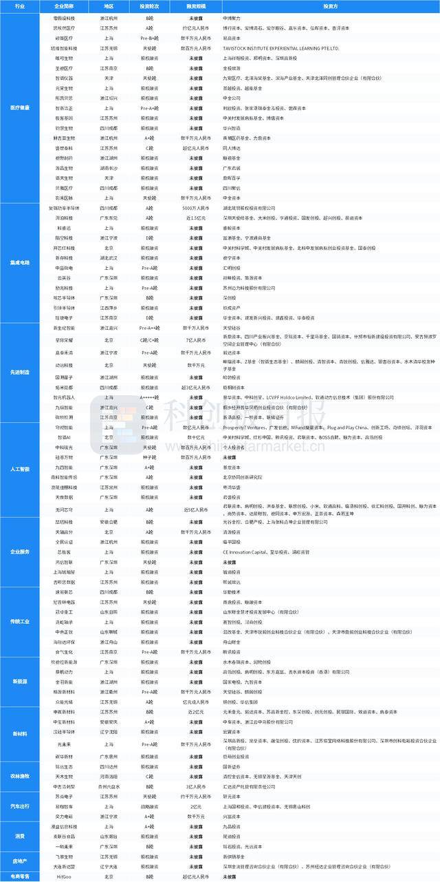 本周的投资方包括红杉中国、高瓴创投、君联资本、启明创投、毅达资本、中科创星、Prosperity7 Ventures、峰瑞资本、麟阁创投、银杏谷资本、祥峰投资、中金资本等知名投资机构;