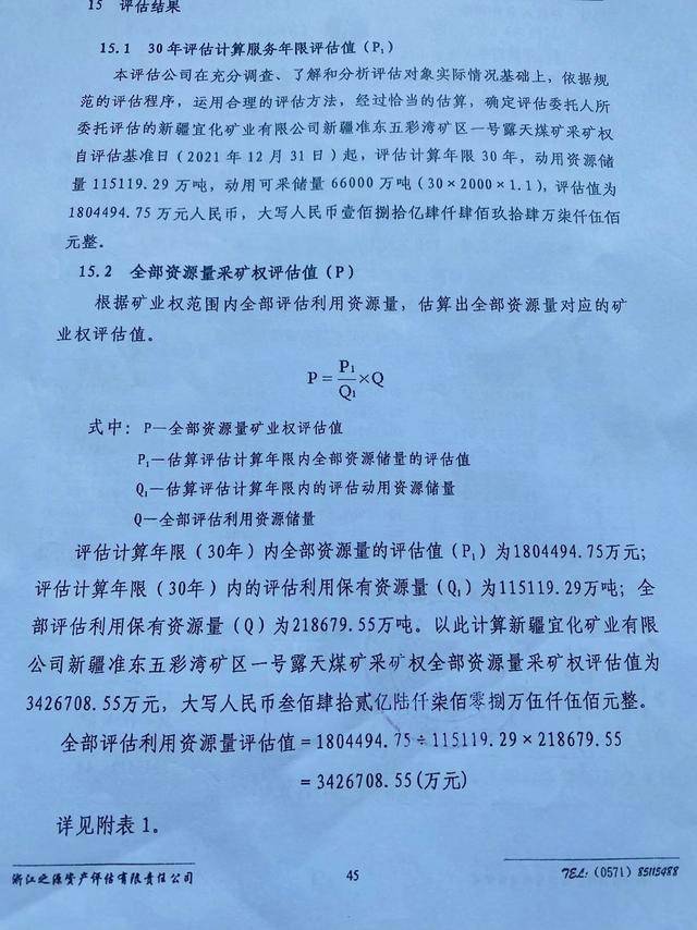 评估机构浙江之源资产评估有限公司2022年4月出具的一份采矿权评估报告书,对新疆宜矿拥有的五彩湾矿区一号露天煤矿采矿权进行了评估,矿区面积44.844平方公里,自评估基准日(2021年12月31日)起,评估计算年限30年,全部资源量采矿权评估值为342.67亿元。