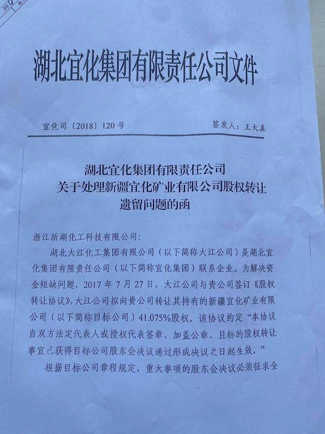受2017年宜化集团前述安全事故影响,湖北大江在持股过程中,曾为解决资金短缺问题,在2017年7月拟以5.38亿元的价格,向新湖集团子公司浙江新湖化工科技有限公司(简称新湖化工)转让其持有的新疆宜矿41.075%的股权。