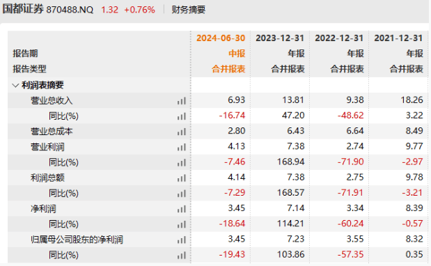 业绩方面,2023年,国都证券营收为13.81亿元,同比增加47.20%;归母净利润7.23亿元,同比增加103.86%。不过今年上半年,国都证券营收和净利均出现一定程度下滑,营收为6.93亿元,同比减少16.74%;归母净利润为3.45亿元,同比减少19.43%。