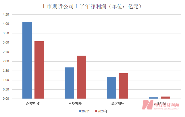 在4家上市期货公司中,除了永安期货上半年净利润下降25.35%外,其余3家期货公司上半年净利润均实现了增长。