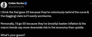 首先是“我觉得应该降息50个基点,但这届美联储是出了名的怂”一派。