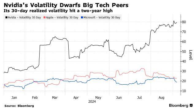 在过去两周里,这家全球领先的人工智能芯片制造商的市值已缩水了约五分之一。对于这一在过去两年几乎以一己之力引领美股涨势的科技巨头来说,最新的暴跌还凸显出了投资者面临的一个更紧迫的问题——如今,英伟达的波动性正令其他“七巨头”同行相形见绌,甚至对比之下,比特币看起来都像是一个平静的港湾。