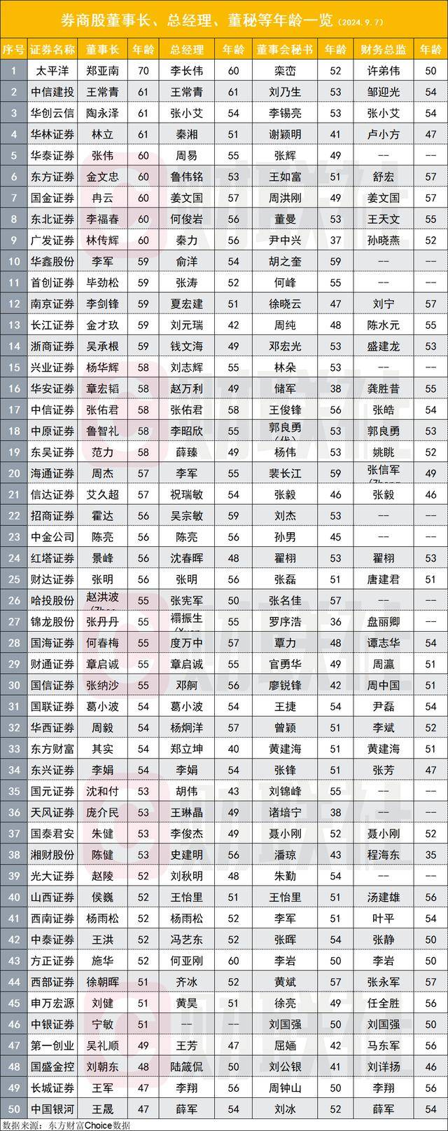 东财Choice数据统计显示,上市券商股中,董事长年龄超过59岁的有14位,其中太平洋证券董事长郑亚南今年已经70岁,其他具体为,华创云信董事长陶永泽(61岁)、华林证券董事长林立(61岁)、中信建投董事长王常青(61岁)、东方证券董事长金文忠(60岁)、东北证券董事长李福春(60岁)、广发证券董事长林传辉(60岁)、华泰证券董事长张伟(60岁)、国金证券董事长冉云(60岁)、南京证券董事长李剑锋(59岁)、浙商证券董事长吴承根(59岁)、长江证券董事长金才玖(59岁)、首创证券董事长毕劲松(59岁)、华鑫股份董事长李军(59岁)。
