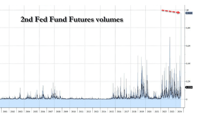彭博汇编数据显示,截至美东时间9月6日周五13点整、北京时间周六凌晨1点,通常交投最活跃的美国联邦基金期货第二档合约成交量达到90万份,创1988年出现这一交易品种以来任何合约的单日成交最高纪录。10月合约的成交量也创新高,突破了2023年3月、也就是硅谷银行倒闭震撼金融市场当月所创的历史最高水平。