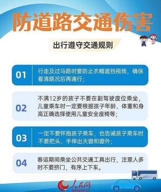 春节,交通事故、一氧化碳中毒、烧伤烫伤等各类安全事故易发。为了让孩子度过一个健康、愉快、安全的春节,家长和孩子要提高安全防范意识,注意预防伤害事故发生。同时,作为监护人,家长应从以下几个方面加强防范,平时也应多叮嘱孩子注意安全。