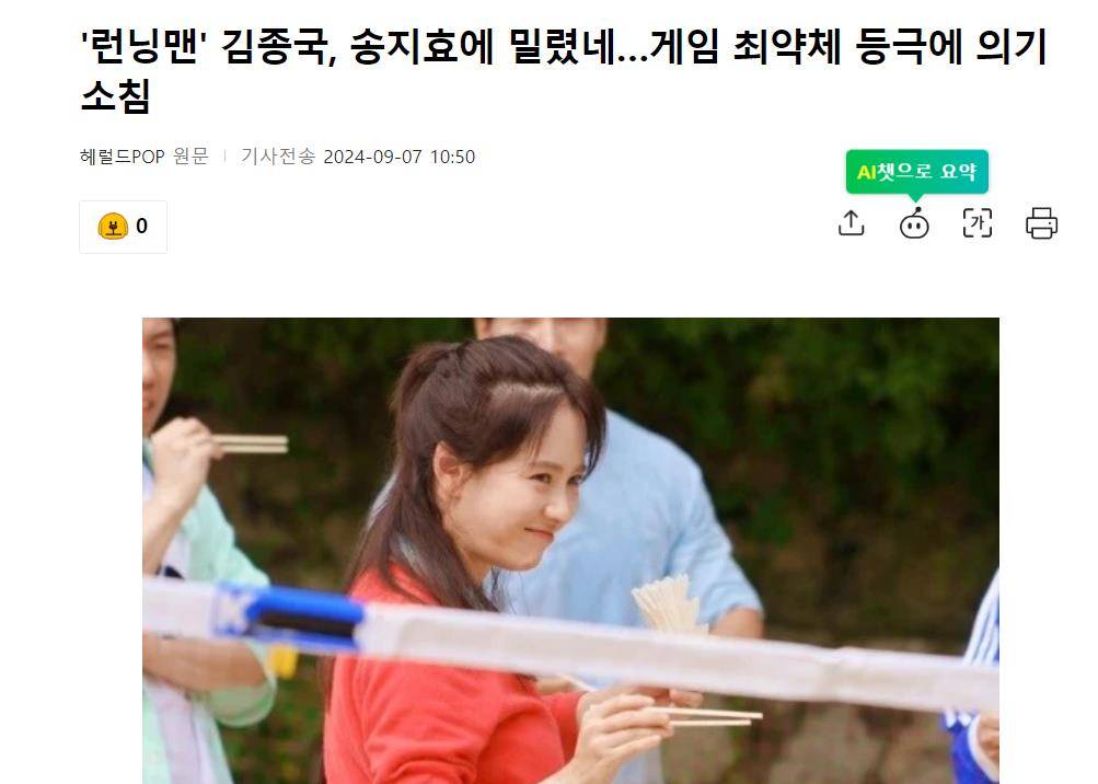 在最新一期的综艺节目《Running Man》中,金钟国输给了宋智孝,因被评为游戏中“最弱的玩家”而感到沮丧。