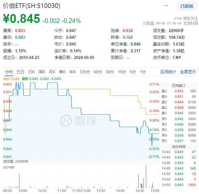 今日(9月6日),大盘又陷回调,高股息再度出手护盘。聚焦“高股息 低估值”大盘蓝筹股的价值ETF(510030)盘中场内价格一度上探0.71%,无奈午后难敌抛压,随市下行,截至收盘,场内价格微跌0.24%,但仍跑赢上证指数(-0.81%)、沪深300指数(-0.81%)等A股主要指数。