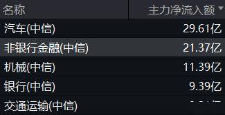 资金面上,今日,非银行金融及银行板块获主力资金大举加码。Wind数据显示,截至收盘,非银行金融及银行板块获主力资金净流入额分别达到21.37亿元及9.39亿元,净流入额均在30个中信一级行业中高居前5。