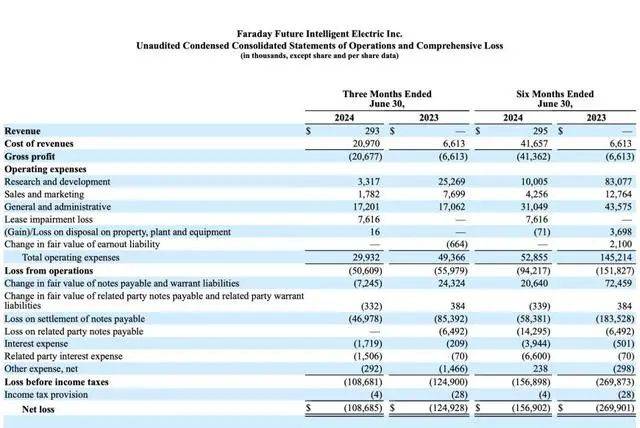 2024年二季度,法拉第未来主要财务数据(图源:财报截图)