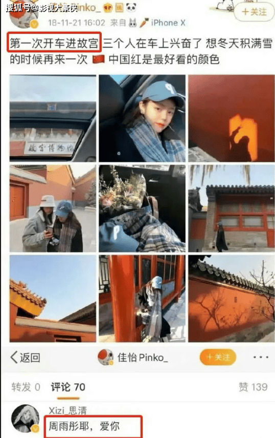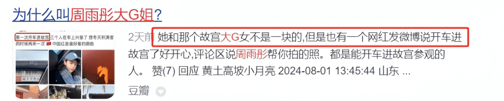 有人说不是她,只是恰好她有一张这个照片;还有人说她是其中之一,还有别人,总之开豪车逛故宫这个印象就留在了周雨彤身上。