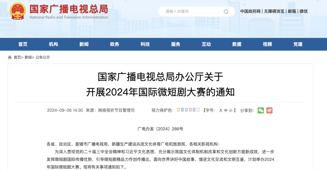 日前,国家广播电视总局发布《关于开展2024年国际微短剧大赛的通知》。