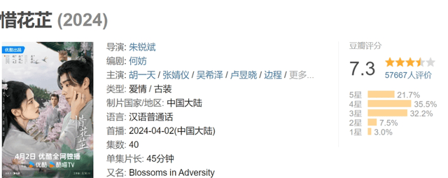 在白夜剧场之外,优酷在生花剧场打造的《惜花芷》,把小清新的甜宠走到深处,用四两拨千斤的方式完成突围,如今超过57000人评分,口碑稳定在7.3。