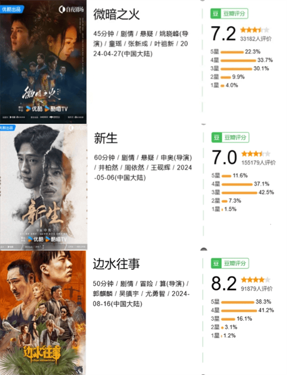在数据足够坚挺的另一面,优酷上半年的剧集口碑也持续突围,上半年完成升级亮相的白夜剧场从开篇之作《微暗之火》再到接档剧《新生》以及后来的《边水往事》,剧场升级后四个月内已有三部剧口碑破7,在社交网站的口碑分更是刷新了2024年的纪录。
