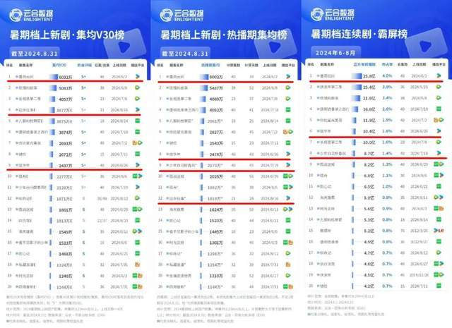 十个名额占据三席,优酷已经无疑成为2024年的暑期档高光,从6月的《墨雨云间》再到8月末的《边水往事》, 算是全面告捷。