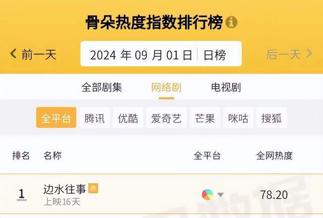 《边水往事》的大结局即便已经上线,但仍然持续领跑各大数据排行,站稳8月末到9月初的剧圈头把交椅。