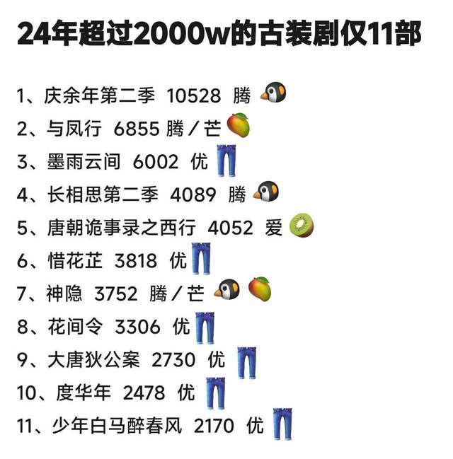 不仅是暑期档,在2024上半年的剧圈数据里,共有11部古装剧集均观看突破2000万,其中优酷的剧集占据了6席,不仅只是拿下全名额里的半壁江山。