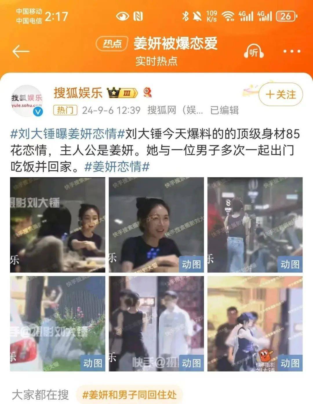 狗仔预告要爆料的顶级身材85花的恋情,主人公是姜妍,她被拍到两次与一男子在聚餐后一起回家,之后又一起从家里外出工作,再一起乘车回家,疑似恋情曝光。(其实姜妍都38岁了,不是什么年轻流量花,谈个恋爱再正常不过,再说视频里也没拍到有什么亲密举动,是不是真男友还不一定呢~)