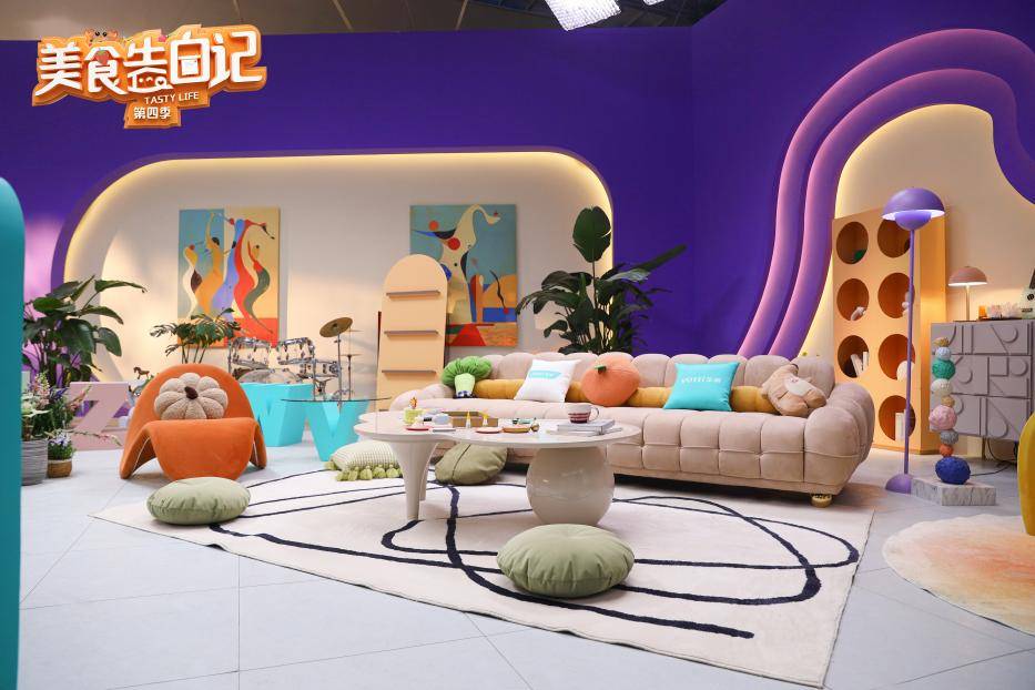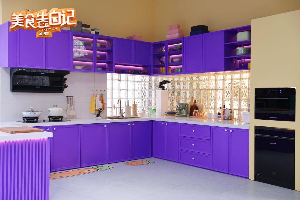 如首期中刘忻、张予曦、王霏霏的“饱藏”厨房,以刘忻最爱的紫色为主色调,填充精美的碗盘厨具,高科技厨房电器等,打造出三人心中宽敞明亮的“梦中情厨”;同时在休闲区还以暖色调家具布置出十分舒适温馨的用餐和休闲区,三人如同坐在家中客厅一般打游戏、聊天、聚餐,在繁忙生活里偷得一段轻松时光,细细感受友情的温暖。