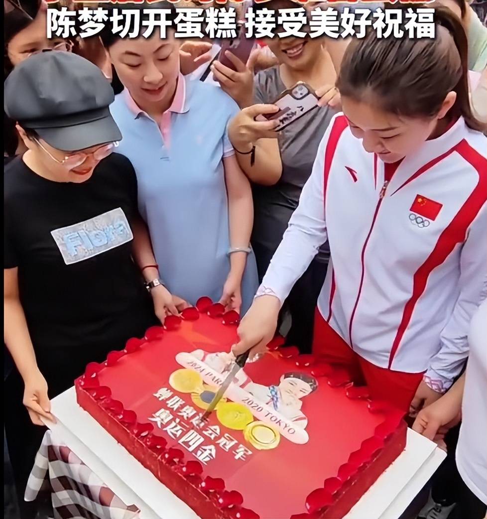 最有意义的是,小区为陈梦准备了一个定制的奥运四金蛋糕非常漂亮。陈梦亲手切开蛋糕,大家热烈鼓掌。陈梦已经一年多没有回家了。老爸表示,陈梦回来就待两天,但是好儿女志在四方,很正常,作为体育人还要发挥更多正能量。