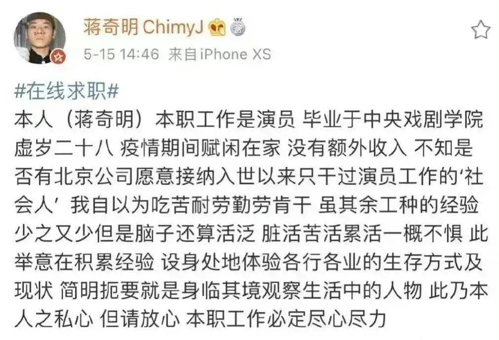 但在2020年,他还是个在微博发在线求职、“脏活苦活累活一概不惧”的小演员,甚至因为没有戏拍做过便利店服务员。