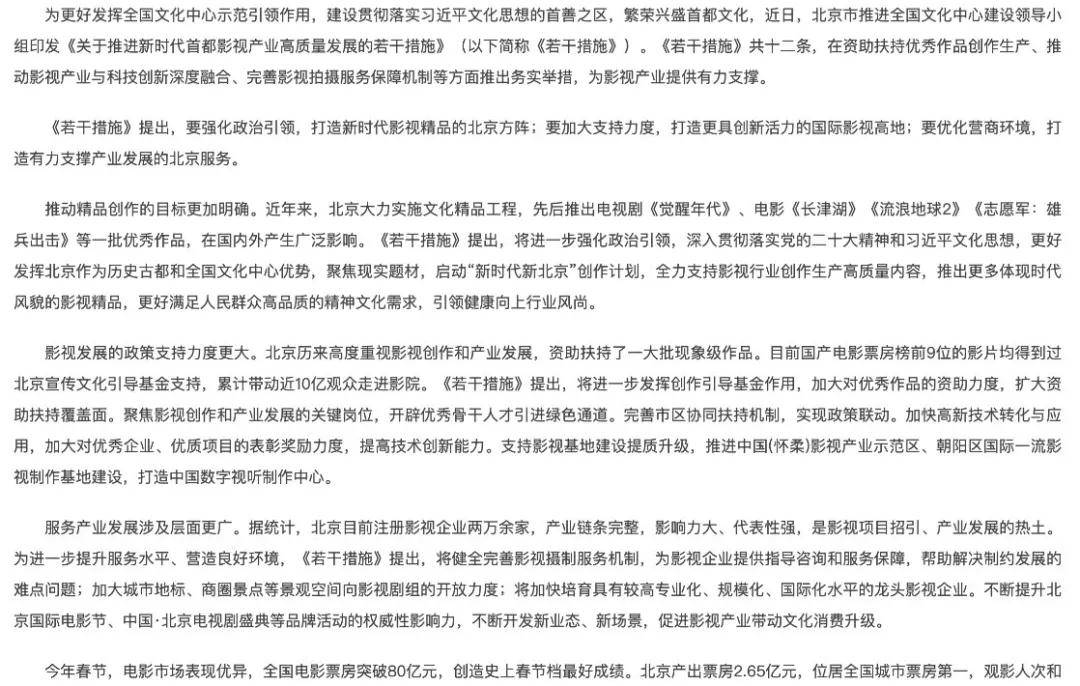《关于推进新时代首都影视产业高质量发展的若干措施》(图源:北京日报)
