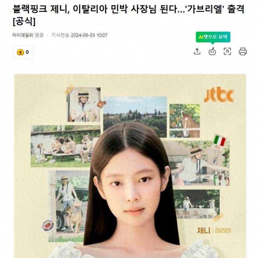 9月3日,有韩国媒体报道,JENNIE已确认出演综艺节目《我是加百列》,并将从第13集开始饰演新加百列。JENNIE的出场预计在第13集(9月27日)和第14集(10月4日)播出,韩国网友们对世界明星JENNIE的新生活很感兴趣,她将在世界的另一边过着别人不认识她的生活。