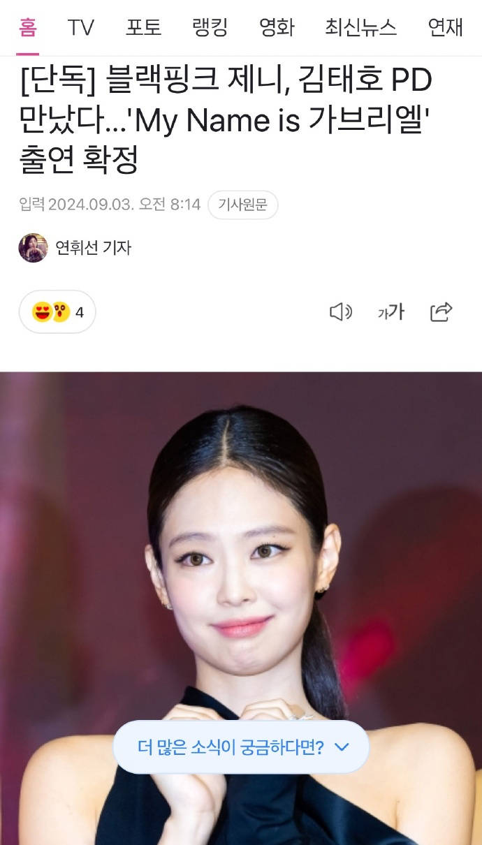 此前韩媒曾报道,继高人气演员池昌旭、廉惠兰、朴宝剑,喜剧人朴明洙、洪真庆确认出演《我的名字是加百列》,超强阵容引发外界期待之后,人气女团 BLACKPINK 成员 Jennie 也有望出演节目。