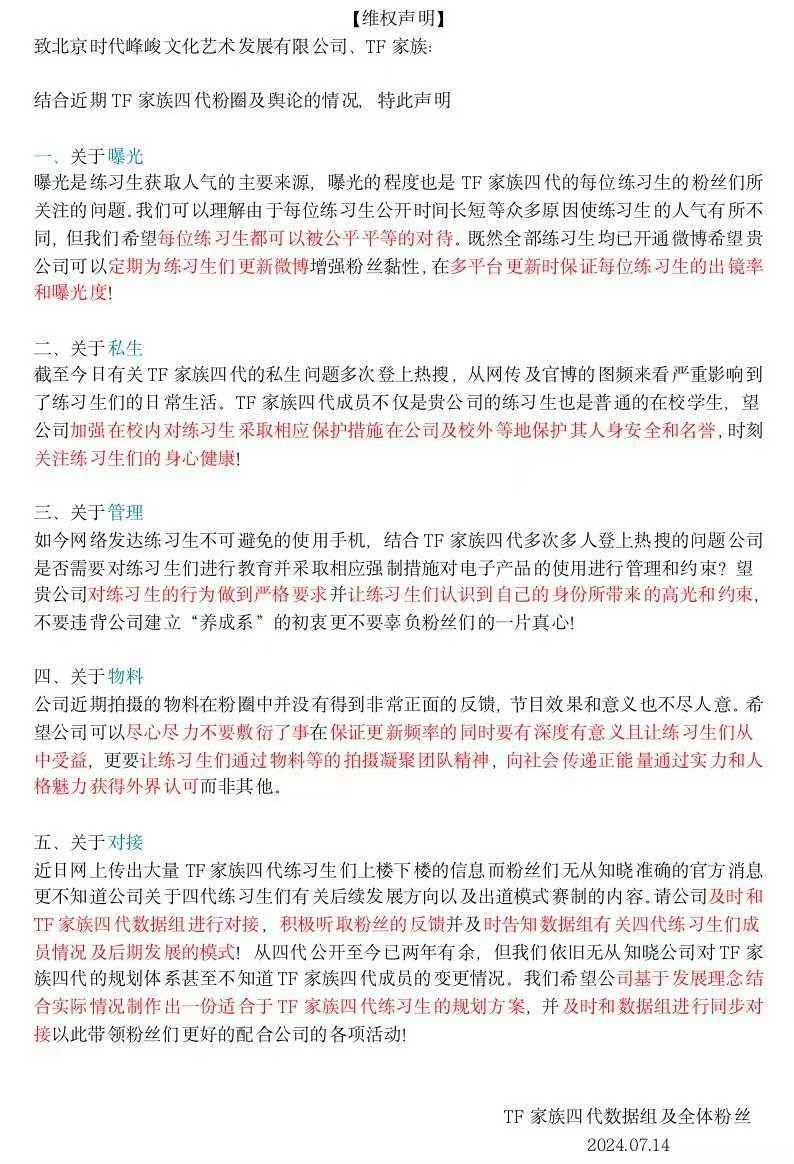 比如在8月10日,TF家族三代数据组便发布联合维权声明,要求时代峰峻必须再演唱会现场宣布出道人选、番位,并指出粉丝愿意承担跨国的舟车劳顿与添加剂票,“都是因为贵司承诺马来西亚演唱会即为出道演唱会”,更强硬要求“拒绝模棱两可”。