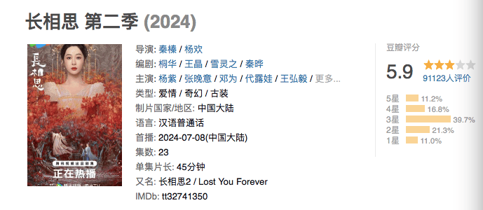 最直观的表现,一是市场热度反响一部不如一部,如景甜和张凌赫主演的《四海重明》热播期有效播放量仅在1000w左右,比去年最“扑街”的古偶《七时吉祥》还要低近600w。二是口碑普遍欠佳,就连播得最火的《墨雨云间》也仅获得6.6的豆瓣评分,《长相思2》更是跌破及格线。