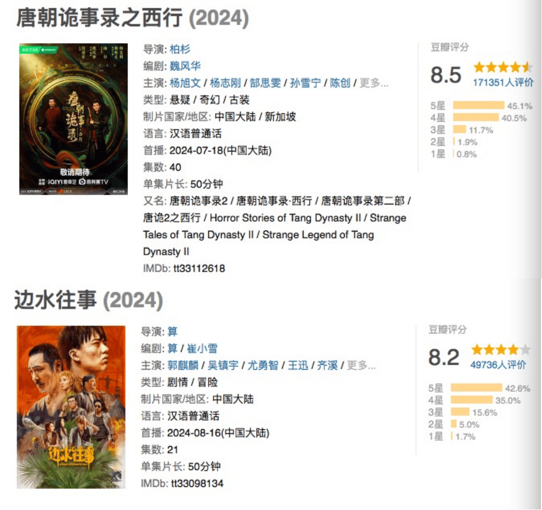 另一个大热赛道则是悬疑领域,不仅数量上占据了暑期市场的重要份额,还相继诞生了《唐朝诡事录之西行》和《边水往事》两部悬疑口碑黑马剧,截至目前二者的豆瓣评分分别为8.5分和8.2分。