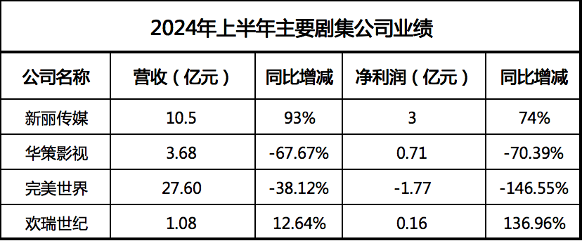 近几日,新丽传媒、华策影视、完美世界、欢瑞世纪等剧集公司相继公布了2024上半年财报。整体来看,上半年剧集市场的部分趋势特点投射在了上市影视公司的业绩之中,既有以多部爆剧拉升收入和利润的佼佼者,也有不进则退、处于调整期的掉队选手。