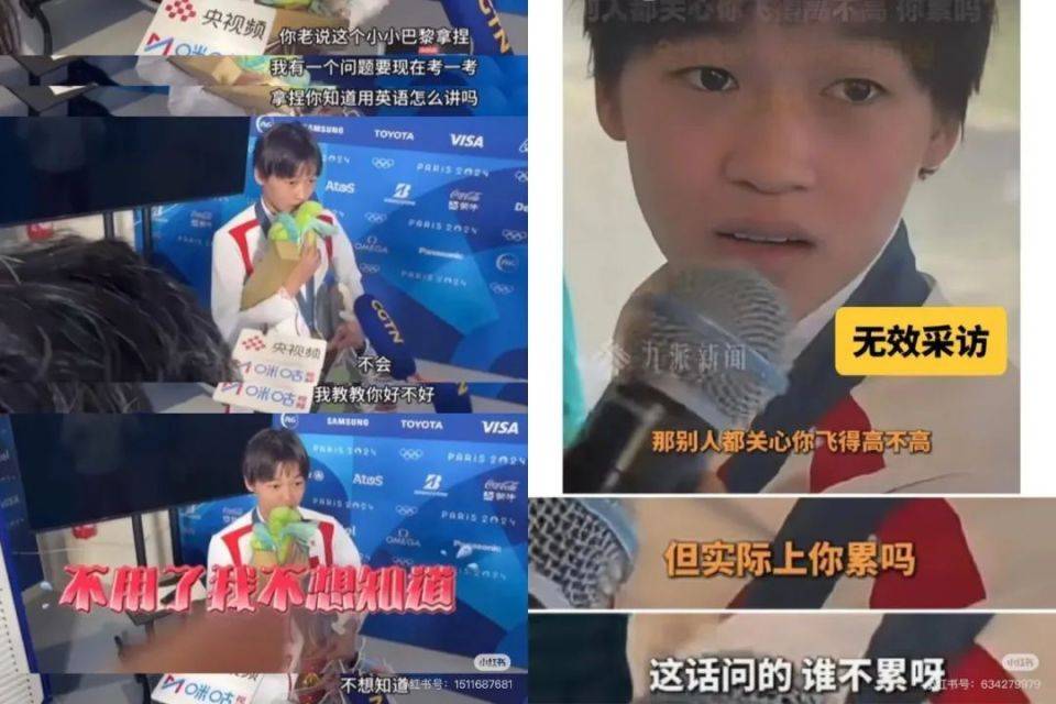 比如在现场要教全红蝉英文,被明确拒绝后还直播连线用“疯疯癫癫”“像白痴一样”评价全红蝉的记者;还有记者走“温情路线”,问全红蝉“别人都关心你飞得高不高,但实际上你累吗?”,最终得到全红蝉“这话问的,谁不累呀?”的回复;还有记者问全红蝉三米板训练的情况如何,一脸茫然的全红婵只能回答,“我跳的是跳台啊!”