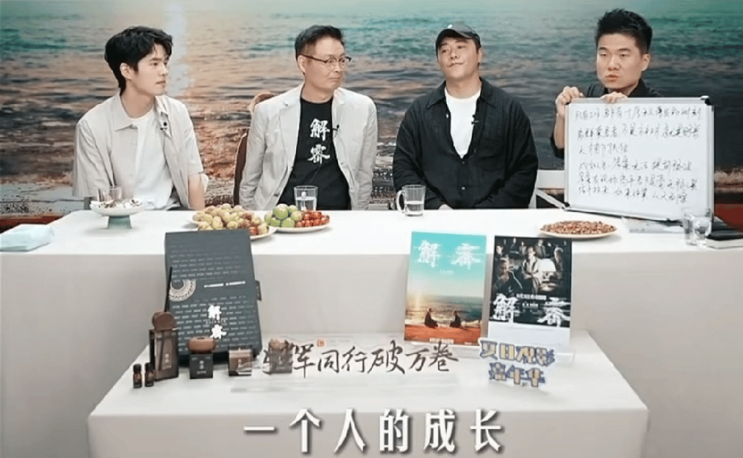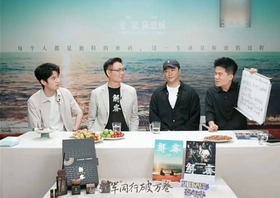 在这场宣传电影《解密》的直播中,董宇辉举着白板,对麦家、陈思诚的发言进行长篇解读,一个人solo了近二十分钟。