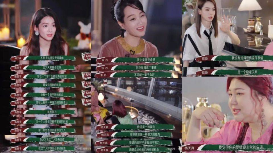 拥有极强“金句输出”能力的杨天真在短时间的采访中,将对面的“姐姐”们也都变成了“金句制造机”,陈昊宇讨论“资源咖”,朱丹分享自己对事业的看法,戚薇则说出“我没有觉得爱情是一个稳定关系”。