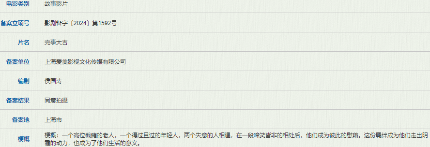 上海爱美影视备案了侯国涛编剧的《完事大吉》,故事讲的是一个高位截瘫的老人,一个得过且过的年轻人,两个失意的人相遇,在一段啼笑皆非的相处后,他们成为彼此的慰藉。这份羁绊成为他们走出阴霾的动力,也成为了他们生活的意义。