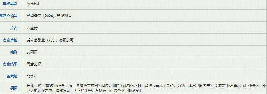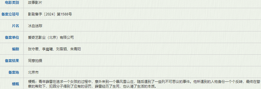 爱奇艺影业备案了张守君、李晨曦、刘吾驷、朱青阳编剧的《冰血迷踪》和武雨泽编剧的《六笙诗》。