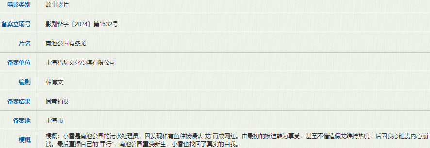 郑恺的公司上海猎豹文化传媒备案了韩博文编剧的《南池公园有条龙》,故事讲的是小雷是南池公园的污水处理员,因发现稀有鱼种被误认“龙”而成网红。由最初的被迫转为享受,甚至不惜造假龙维持热度,后因良心谴责内心崩溃。最后直播自己的“罪行”,南池公园重获新生,小雷也找回了真实的自我。