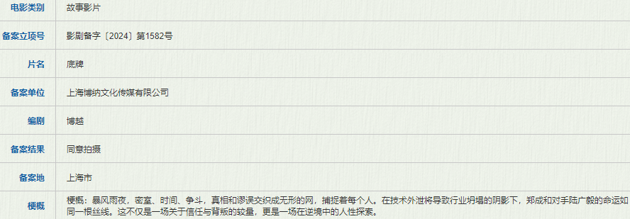 上海博纳文化传媒备案了博越编剧的《底牌》,故事讲的是暴风雨夜,密室、时间、争斗,真相和谬误交织成无形的网,捕捉着每个人。在技术外泄将导致行业坍塌的阴影下,郑成和对手陆广毅的命运如同一根丝线。这不仅是一场关于信任与背叛的较量,更是一场在逆境中的人性探索。