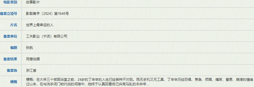 工夫影业备案了张航编剧的《世界上最幸运的人》,故事讲的是在大年三十被困浴室之前,24岁的丁辛辛的人生已经各种不对劲。既无手机又无工具,丁辛辛历经恐惧、焦急、烦躁、痛苦、窒息、崩溃的情绪过山车,在与洗手间门锁对战的间隙中,她终于认真回看自己兵荒马乱的本命年。