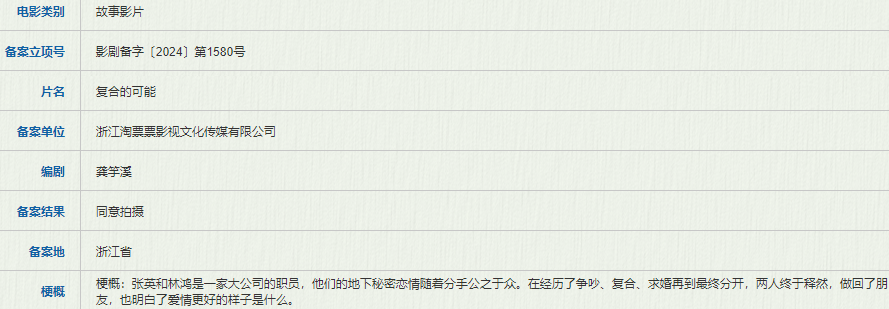 浙江淘票票影视文化传媒备案了龚竽溪编剧的《复合的可能》,故事讲的是张英和林鸿是一家大公司的职员,他们的地下秘密恋情随着分手公之于众。在经历了争吵、复合、求婚再到最终分开,两人终于释然,做回了朋友,也明白了爱情更好的样子是什么。
